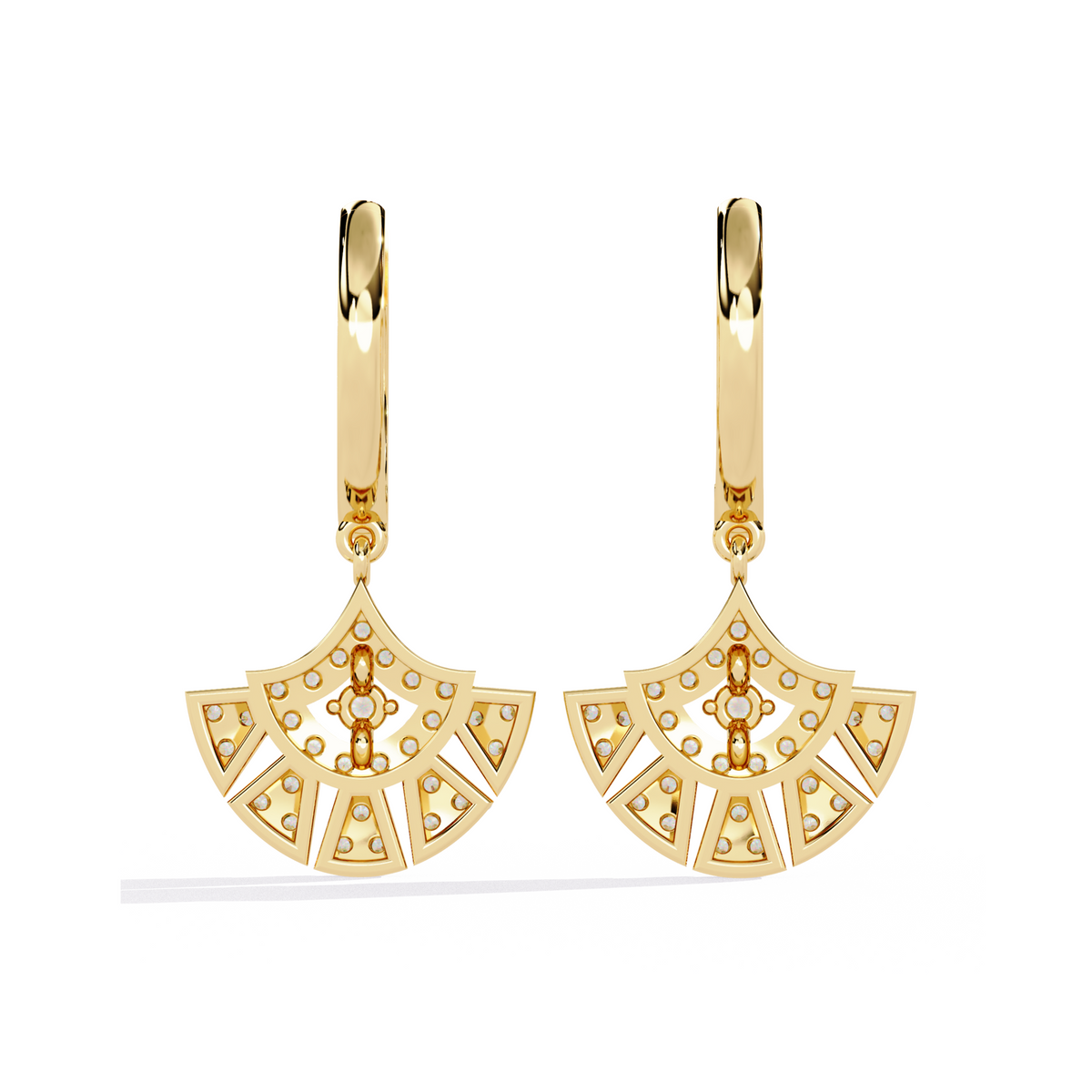 Step into luxury with the Radiant Royale Diamond Hoop Earrings, a masterpiece of elegance and brilliance. Designed to resemble a regal fan, these earrings showcase an intricate arrangement of dazzling diamonds set in a gold and white gold finish. The geometric symmetry and central solitaire stone add a touch of sophisticated charm, making these earrings a perfect choice for weddings, grand celebrations, or statement styling. Elevate your jewelry collection with this breathtaking fusion of modern artistry and timeless allure.