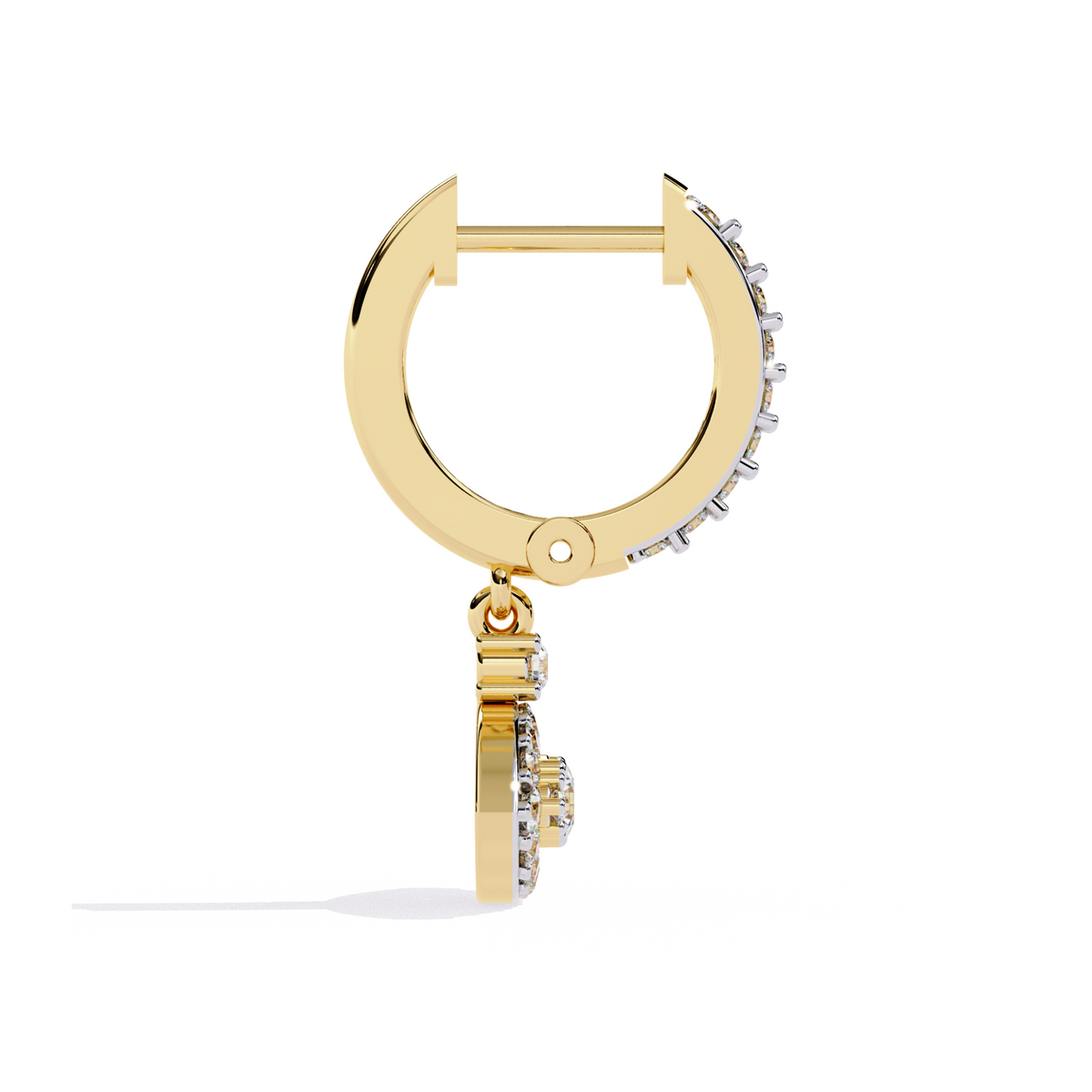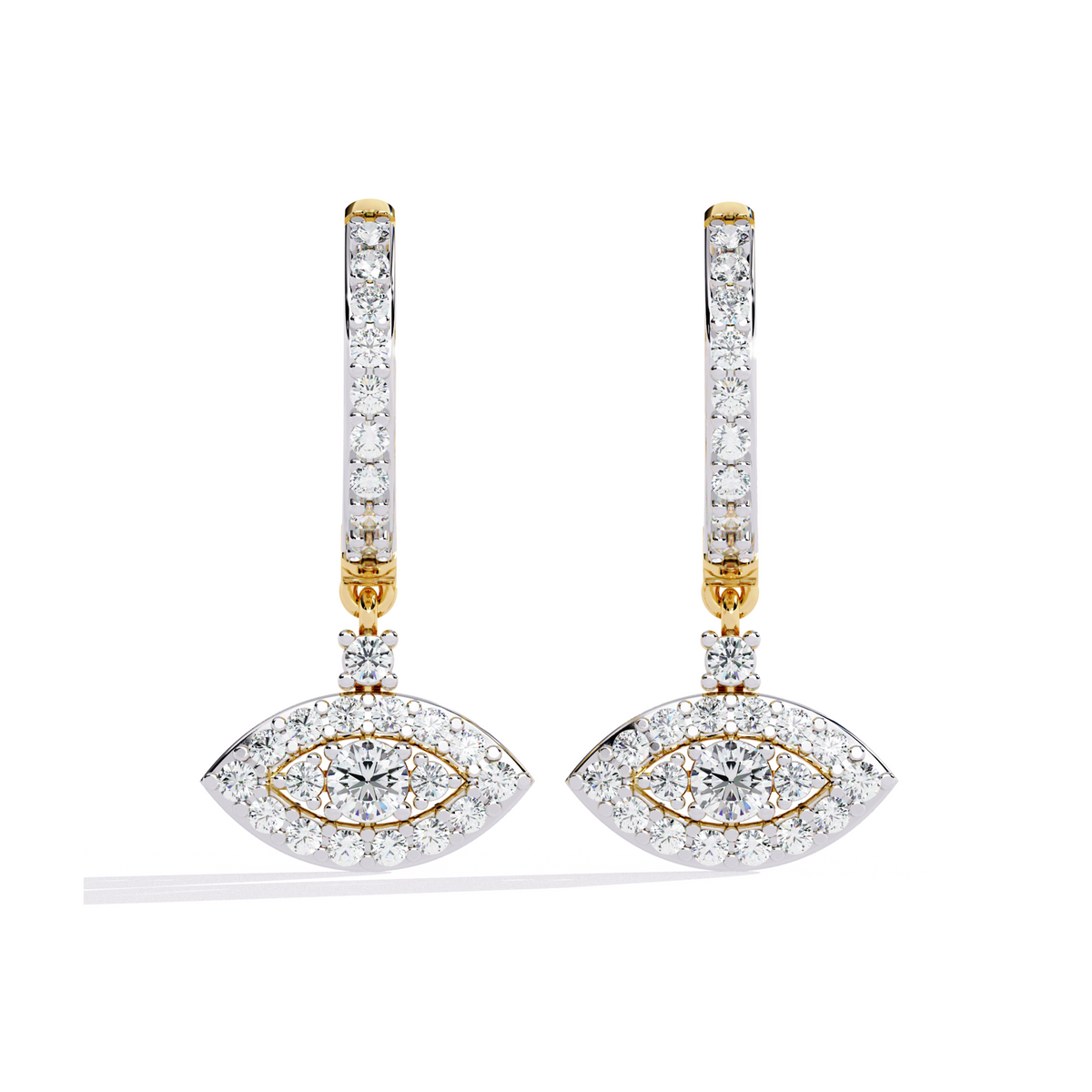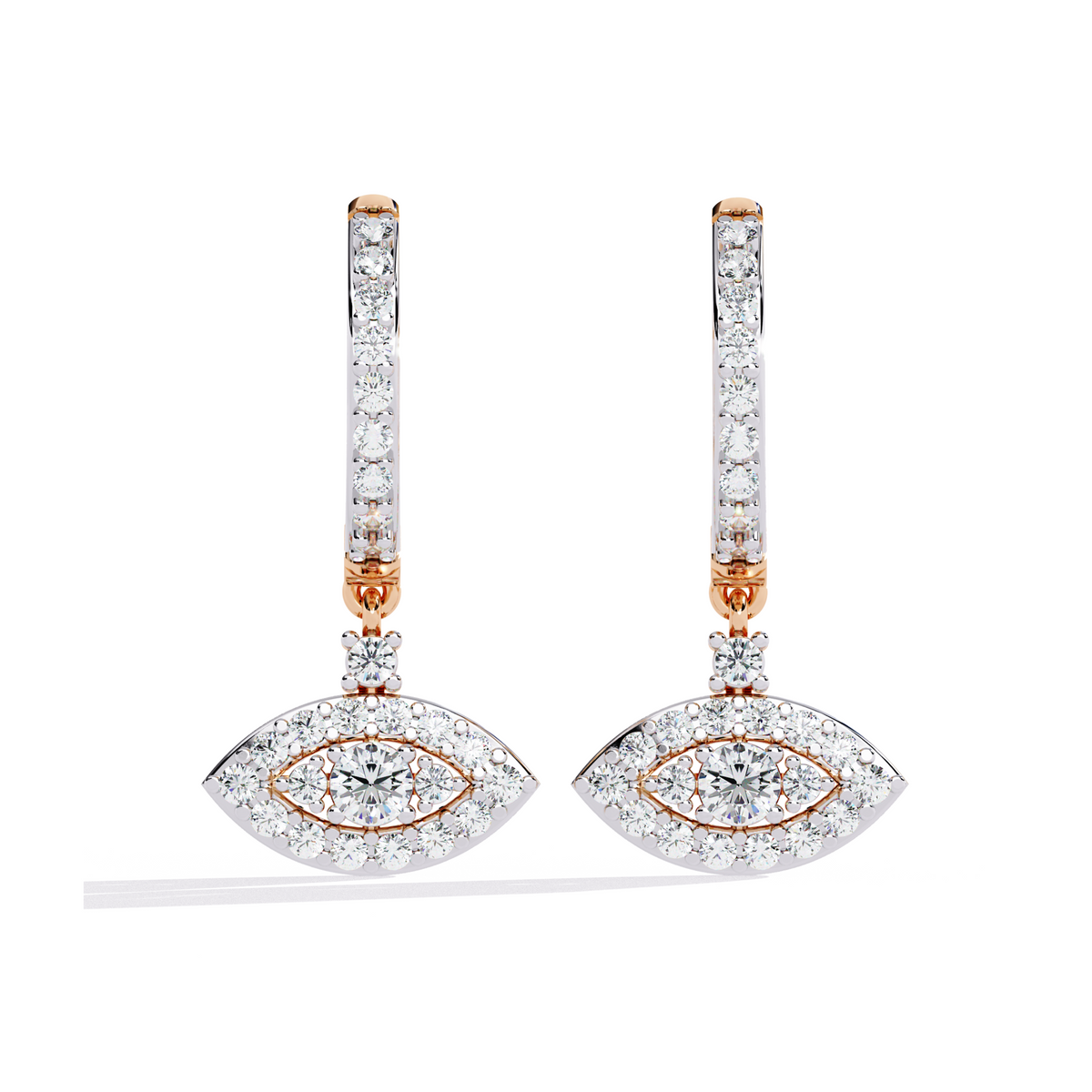 Embrace timeless elegance and protection with these Evil Eye Diamond Hoop Earrings. Adorned with a mesmerizing halo of sparkling diamonds, the eye-shaped pendant symbolizes strength, positivity, and good fortune. The blend of white gold and rose gold accents enhances its brilliance, making it a perfect fusion of luxury and meaning. Whether for daily wear or a special occasion, these earrings are a stunning statement of style and grace.